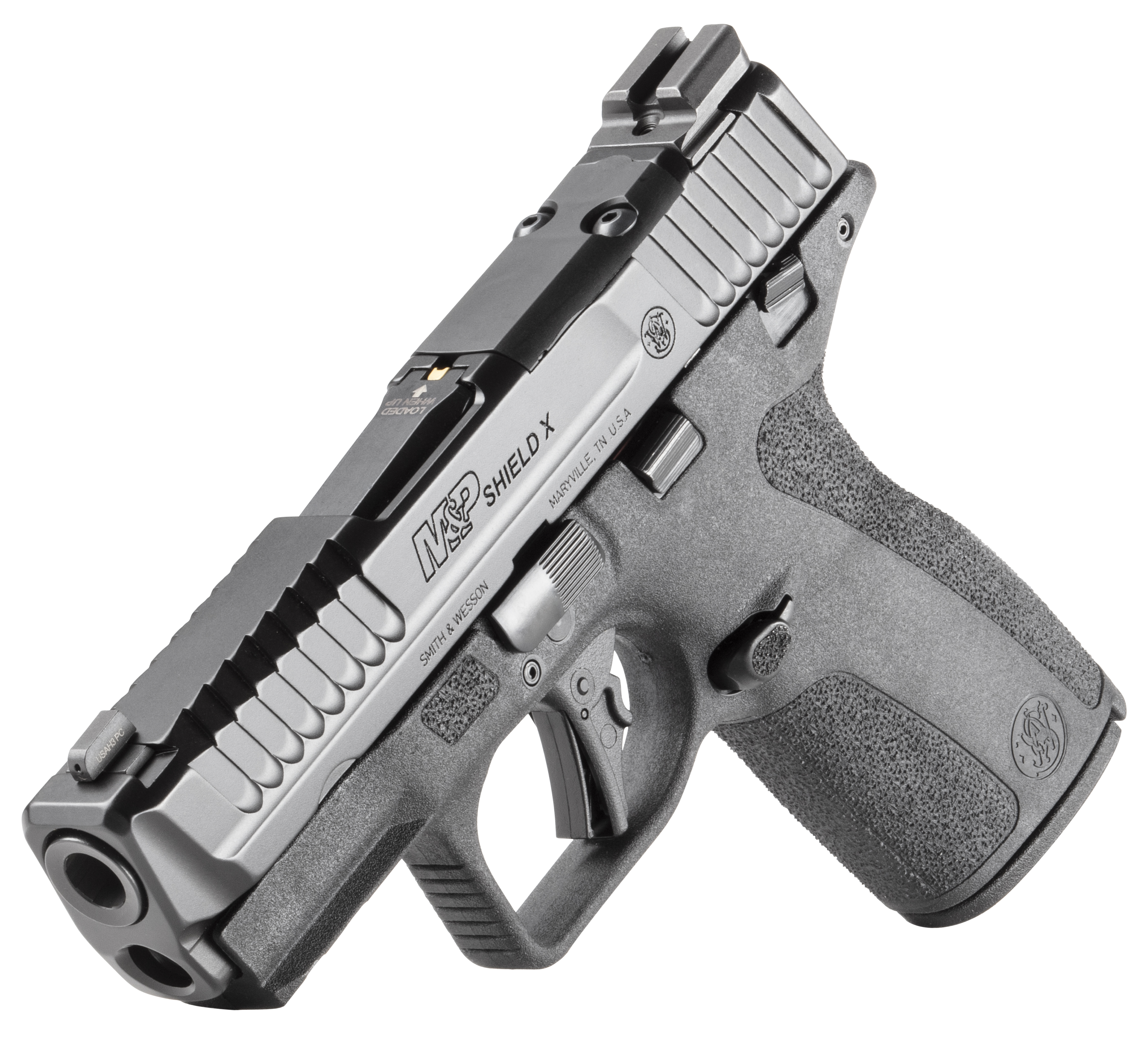 Designed to enhance the Shield series from Smith & Wesson the M&P Shield X focuses on versatility. Featuring aggressive front and rear serrations for racking a reversible magazine catch and a longer grip to maximize capacity the Shield X ensures adaptability for any scenario. Improved ergonomics make for a better fit and feel in the hand for added comfort during extended range sessions. Customize to your needs with a flat-plane RMSc/K optic cut and front rail. Comfortable reliable and confident - the Shield X is the ideal choice for shooters of any skill level. - Aggressive Slide Design- Aggressive front and rear serrations for effective racking. - Tactile Loaded Chamber Indicator- Operator can both see and feel when a round is in the chamber. - New Ergonomic Design- Improved ergonomics to help fit and feel when handling the pistol and help control recoil. - 3.6 1:10 twist stainless steel barrel w/Armornite� finish. - Stainless steel slide w/Armornite� finish w/ RMSc/K optic cut. - Blacked-out serrated-notch rear sight. - Ameriglo� Trooper LumiGreen front night sight. - Slim textured grip front and rear. - Flat-face trigger. - Manual Thumb Safety. - Frame is equipped with a front rail. - Ships with (two) 10-round magazines. - width 0.9 in - length 6.87 in - height 4.9 in - weight 20.8 oz - CALIBER 9MM - SIZE MICRO-COMPACT - CAPACITY 10 - ACTION STRIKER FIRED - BARREL LENGTH 3.6 - GRIP POLYMER - SIGHTS NIGHT SIGHTS - OPTIC READY YES - SAFETY THUMB & MAGAZINE DISCONNECT SAFETY - COLOR/FINISH BLACK - STATE COMPLIANCE CA CO CT DE HI IL MD NJ NY RI VT WA DC - THREADED BARREL NO - BARREL MATERIAL STAINLESS STEEL - FRAME POLYMER - NUMBER OF MAGAZINES 2 - 10LB TRIGGER NO - MODEL SHIELD X