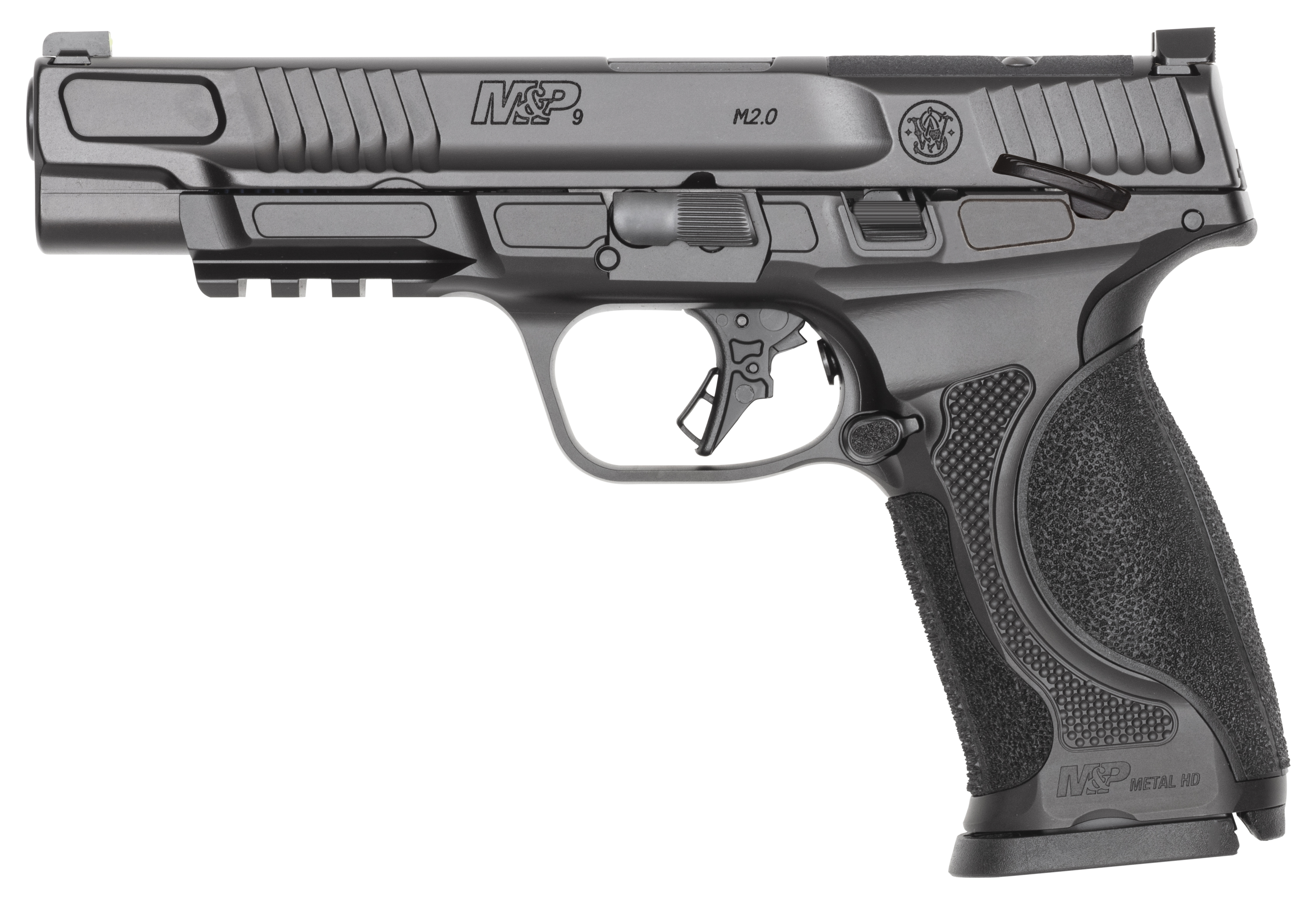 The next evolution in the M&P line of handguns the Metal HD represents the ultimate heavy-duty pistol. Excelling in competition or any situation that requires repeatable accurate shots on target the Metal HD dominates the field. Combining a stainless steel frame with new texturing a 5 stainless steel barrel and more positive slide serrations this pistol melts into your hand and balances like an extension of your arm while also providing positive purchase on the slide for easy racking. The Metal HD is the perfect package yielding nothing but the best shooting experience of any M&P yet. - 5 Barrel and All-Stainless Frame- Heavy stainless build and 5 barrel reduce recoil for faster more accurate follow-up shots. - Enhanced Frame Texture- Aggressive texture ensures secure non-slip grip even in wet or sweaty conditions. - Night Fision Tritium Front Sight- Bright tritium glow delivers fast reliable sight acquisition in any lighting. - 5 1:10 twist stainless steel w/Armornite� finish. - Stainless steel slide w/Armornite� finish. - Blacked-out serrated U-notch rear sight. - Night Fision� Yellow/Green tritium front sight. - Full-size forged stainless steel frame w/Armornite� finish. - Flat-face trigger. - Manual Thumb Safety. - Frame is equipped with a front rail. - Total of four interchangeable palmswell grip inserts. - Ships with (two) 10-round magazines. - width 1.3 in - length 8.25 in - height 5.5 in - weight 34.9 oz - CALIBER 9MM - SIZE FULL - CAPACITY 10 - ACTION STRIKER FIRED - BARREL LENGTH 5 - GRIP POLYMER - SIGHTS NIGHT SIGHTS - OPTIC READY YES - SAFETY THUMB SAFETY - COLOR/FINISH BLACK - STATE COMPLIANCE CO CT DE HI IL MD NJ NY RI VT WA DC - THREADED BARREL NO - BARREL MATERIAL STAINLESS STEEL - FRAME STAINLESS STEEL - LASER NO - NUMBER OF MAGAZINES 2 - 10LB TRIGGER NO - MODEL M&P 2.0 METAL HD
