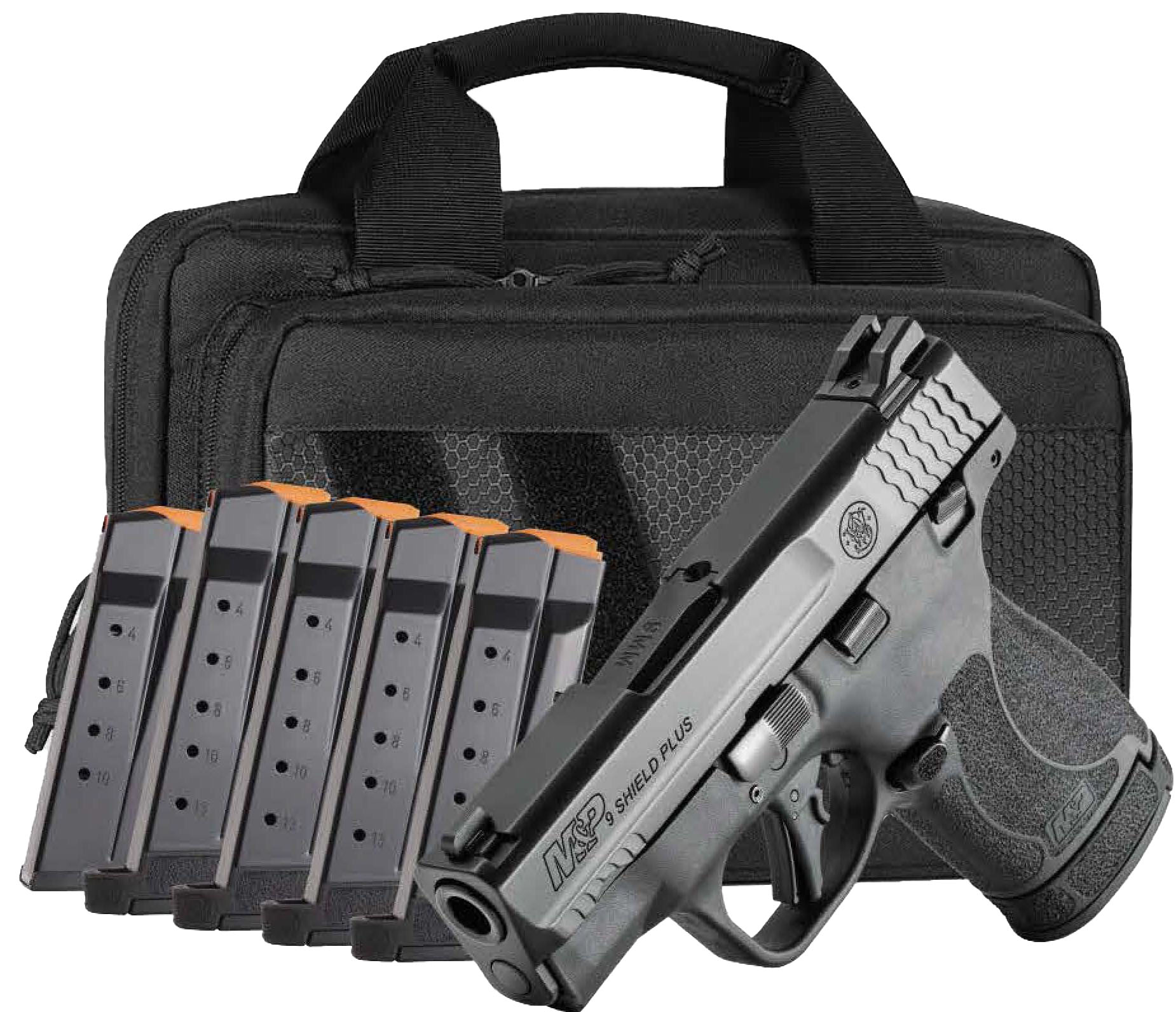 Flat face trigger for consistent trigger finger placement that allows for more accurate and repeatable shooting. - Enhanced grip texture allows the user to manage recoil keep a firm grip and delivers comfort when concealing. - Extended magazine offers 13+1 round capacity. For more concealable option we offer a flush-fit 10 round magazine. - 13 round and 10 round magazines included. - Tactile and audible trigger reset. - Extremely thin and lightweight -can be comfortably carried all day. - M&P's patented take-down lever and sear deactivation systems all for disassembly without pulling the trigger. - Optimal 18-degree grip angle for natural point of aim. - Armornite durable corrosion resistant finish. - Backed by Smith & Wesson's Lifetime Service Policy. - Model M&P 9 SHIELD PLUS Manual Thumb Safety - Caliber 9mm Luger - Capacity 10+1 13+1 - Safety Manual Thumb Safety - Length 6.1 - Front Sight White Dot - Rear Sight White 2-Dot - Action Striker Fire - Grip Polymer - Barrel Material Stainless Steel with Armornite Finish - Slide Material Stainless Steel with Armornite Finish - Frame Material Polymer - Slide Finish Matte Black - Frame Finish Matte Black - Barrel Length 3.1 (7.9 cm) - Weight 20.2 oz. - Includes: - M&P�9 Shield� Plus TS 6 Total Mags - With either a standard 10+1 round or 13+1 extended 9mm magazine the new Shield Plus is a modern fit for everyday carry. - Savior� Specialist Bag - The Savior Specialist bag with its unique front panel is designed and tested specifically for professionals. Features on this pistol case are tailored to hold all your range day accessories.