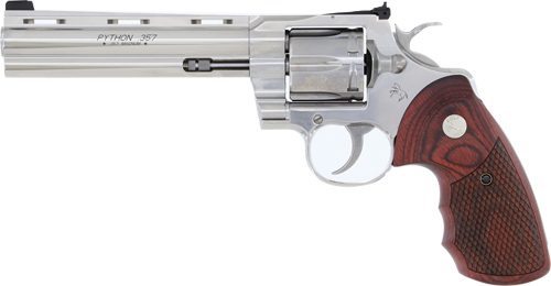 Colt's Manufacturing Python, Revolver, Double/Single Action, 357 Magnum, 6", Silver, Wood, 6 Rounds, 1:14, Colt Python 6" Stainless Steel, Stainless Steel, Upgraded Snake Scale Walnut Grips, Brass Bead Front Sight PYTHON-SP6WBB-TLS