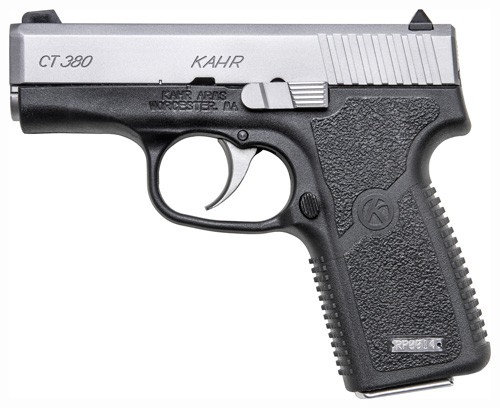 Action: DAO - Caliber: .380 Auto - Capacity: 7rd - Barrel: 3 - Receiver: Polymer Black - Slide: Stainless Steel Matte - Sights: Drift Adjustable White Bar-Dot Combat Rear Sight Pinned-In Polymer Front Sight - Length: 5.52 - Height: 5.3 - Weight: 11.44oz - The new CT380 features a 3.0 inch barrel an overall length of 5.52 inches and a height of 5.3 inches. It weighs just 11.44 ounces without a magazine. The pistol has a black polymer frame and features 4140 steel inserts molded into the front and back of the frame for added rigidity. It has a machined solid 416 matte stainless steel slide and a textured polymer grip. - The Kahr CT380 features a lock breech modified Browning type recoil lug and features the safe cam action and offset recoil lug barrel design found in all Kahr pistols. The result is a compact pistol with very little felt recoil and quick follow-up shots. The pistol features drift adjustable white bar-dot combat rear sight and pinned-in polymer front sight. Lastly the slide locks back after firing the last round another feature missing on a number of other value-priced compact semi-auto pistols. The durability and reliability of the CT380 model makes it a strong consideration as a backup gun for law enforcement. - Differences between the Kahr Value Series CT380 and the Kahr Premium Series P380 models include: the CT series has a conventional rifled barrel instead of the match grade polygonal barrel found on Premium models; the CT slide stop lever is MIM (metal-injection-molded) instead of machined; the CT series slide has fewer machining operations and uses simple engraved markings instead of roll markings; the P380 comes with three magazines and is shipped in a lockable plastic case. The CT Value series comes with one 7 rd. stainless steel magazine and ships in a cardboard box.