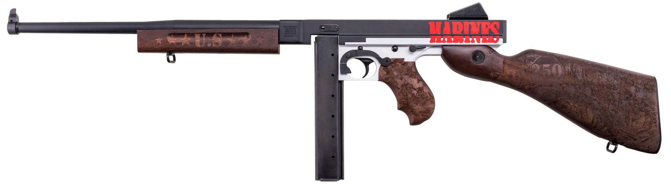 Honor two and a half centuries of valor with this commemorative set a tribute featuring two iconic firearms masterfully customized by Altered Arsenal: the Thompson M1 Carbine and the 1911A1 pistol. - The Thompson carbine features a two-tone black-and-white receiver with MARINES boldly emblazoned in USMC Red. Its top is adorned with a red and gold design evoking the iconic Dress Blue uniform while the wood furniture is engraved with historic battle scenes. The matching Auto-Ordnance 1911A1 pistol complements it perfectly. Its brilliant white frame and midnight blue slide emulate the formal Dress White uniform highlighted by a gold-inlaid 250 YEARS and blue MARINES emblems. The custom grips bridge history depicting a Revolutionary War-era soldier and a modern Marine. - This unique pair celebrates the Corps� visual heritage by representing both major dress uniforms. Chambered in the formidable .45 ACP this set is the ultimate tribute for any Marine veteran or collector. The carbine includes 20 and 30-round magazines and the pistol includes a 7-round magazine completing a collection worthy of the Few and the Proud. - Caliber .45 ACP - Barrel 16.5 Smooth - Finish Midnight Blue Cerakote and Stormtrooper White Cerakote - Material Steel - Length 38 overall - Weight 11.5 lbs - Sights Blade front fixed battle rear - Magazines 30 round stick and 20 round stick - Stock Walnut fixed stock and horizontal foregrip - Warranty 1 Year