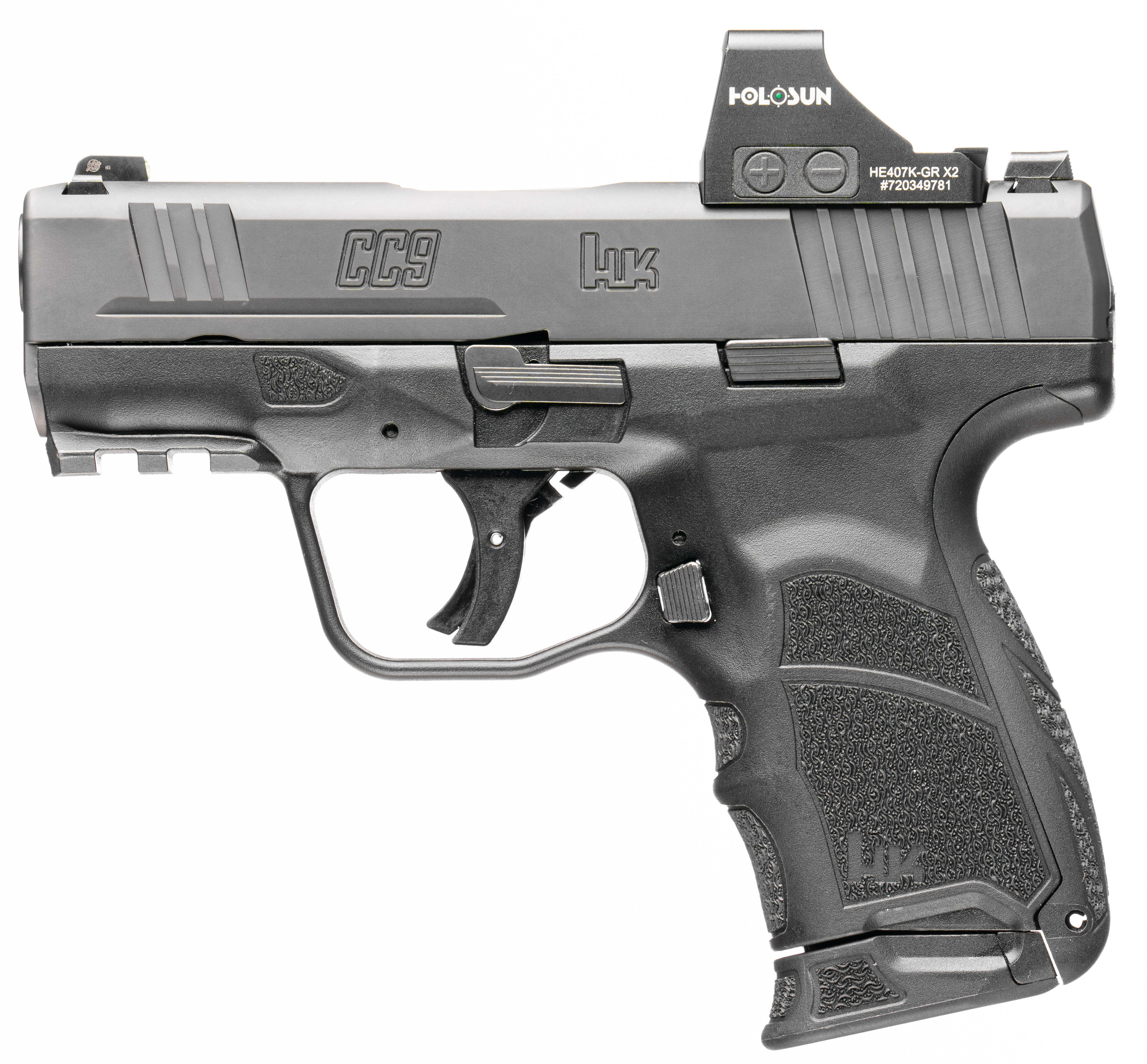 Heckler & Koch CC9 Optics Equipped, Semi-automatic, Striker Fired, Polymer Frame Pistol, Sub-Compact, 9MM, 3.32" Barrel, DLC Finish, Black, Tritium Front Sight with Black Rear, Includes Holosun 407K, 2 Magazines, 10 Rounds 81001132