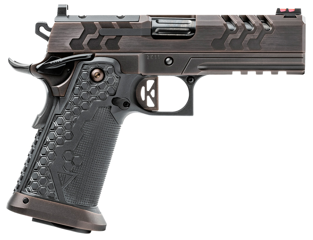 The Kimber 2K11 has raised the bar for competitive shooting; and now concealed carry with the introduction of the 2K11 Pro. The 2K11 Pro is not the next step. It's the culmination of everything we've learned perfected and engineered as stewards of the 1911 legacy. - Every 2K11 is individually assembled by a single expert technician demonstrating our uncompromising commitment to quality. Best-in-class accuracy and peerless trigger feel is deeply rooted in Kimber's DNA. A multi-generational brand signature that has been validated time and again by expert feedback. This heritage coupled with its superior recoil impulse the 2K11 Pro translates perfect harmony between biomechanics and ballistics. Delivering the same world-class features as the 5-inch model the 2K11 Pro features a 4.25 fluted crowned barrel and rocksolid external extractor. Kimber's GT Trigger delivers short travel zero creep and crisp break between 3.0 and 4.0 lbs. The tool-less guide rod is a patent pending Kimber design that delivers ease of cleaning and disassembly. Kimber's engineers pushed the limits with our enhanced sub-frame for superior magazine fit and control. Grip module options include aluminum at a fraction of the competition's price. The stainless-steel slide features a disconnector ramp for smoother operation. The accessory rail supports lights and lasers while the slide is equipped with TAG� Custom FiberLok 2 front sights and comes standard with a C&H� Precision optics plate for the Trijicon RMR family (other footprints available). - Specifications - Height (inches) 90� to barrel: 5.76 - Weight (ounces) with empty magazine: 35 - Length (inches): 7.79 - Magazines Included: (2) 19RD UHC magazines - Recoil spring (pounds): 12 - Tool-less Guide Rod (Patent-pending) - Slide - Material: Stainless Steel - External extractor - Bronze PVD finish - Custom 2K11 front and rear serrations - *Finish will change depending on lighting conditions* - Sights - Fixed rear sight cover plate - All 2K11 models ship with a C&H Precision optic adapter plate - RMR footprint. - C&H Precision Optic adapter plates available for purchase in RMR RMSc DPP ACRO and 509T - Front: TAG FiberLok 2 - Radius: 6.8 - Trigger - GT Match Grade Trigger - 3-4lb pull - Material: Aluminum - Frame - Material: Stainless Steel - Width (inches): 1.53 - SST steel sub-frame with matte Bronze PVD finish - Tapered magwell - Ambidextrous safety - *Finish will change depending on lighting conditions* - Barrel - Length (inches): 4.25 - Material: Stainless Steel - Twist rate (left hand): 5R rifling 1:10 - Fluted - Ramped - Black DLC finsih - Grips - Composite MJD Grip Module - MJD Magwell