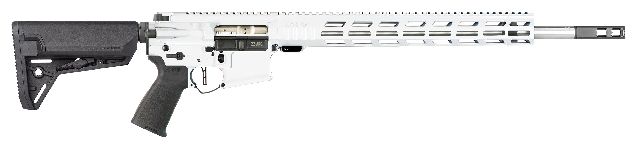 18 416 SST Barrel (1:7 Twist) - .750 Rifle-Length Gas System - Diamond-Honed Nitride M16 BCG (6.5 Grendel Bolt Face) - APF 3.5 lb. Drop-In Trigger - APF Adjustable Gas Block - APF Butcher-16 Muzzle Break - Magpul ACS Stock - Magpul MOE Grip - APF 15 M-Lok Handguard - Billet Receiver Set - Ambidextrous Controls - Caliber/ Gauge: 22 Arc - Barrel Length: 18 416 SST Barrel (1:7 Twist) - Action: Semi-Auto - Front Sight: Rear Sight: None - Color: White - Finish: Cerakote - Material: Aluminum - Hand: Right