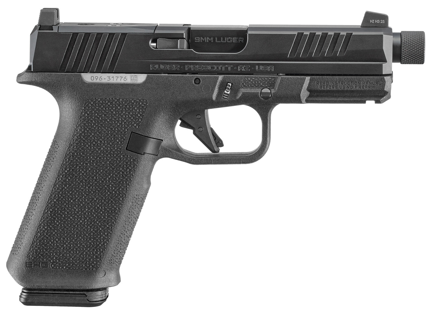 Caliber: 9mm Luger - Capacity 17+1 - Grip Frame Black Magpul Enhanced Handgun Grip - Front Sight Tritium Co-Witness Height - Rear Sight Steel Drift Adjustable - Thread Pattern 1/2-28 - Manual Safety No - Magazines Included Two PMAG 17 GL9 - Optic Ready Yes - Overall Length 7.65 - Barrel Length 4.50 - Barrel Material Alloy Steel - Barrel Finish Black FNC Nitride - Slide Material Through-Hardened Alloy Steel - Slide Finish Black FNC Nitride - Slide Width 1 - Weight 23.8 oz. - Height 5.60 - Grooves 6 - Twist 1:10 RH - Removable serialized stainless steel Fire Control Insert (FCI) set inside an interchangeable Magpul� Enhanced Handgun Grip (EHG) for enhanced flexibility and customization. - Most major components are designed for Gen 3 compatibility with off-the-shelf parts holsters and accessories. - Magpul EHG features Magpul's 3/4-scale TSP texture for a secure grip without discomfort or damage to clothing during concealed carry and textured indexing pads for consistent finger / thumb placement. - Other EHG features include: a low-profile flared magazine well for quick and easy magazine insertion; a trigger guard undercut and beaver tail that promote a high grip for better control; a magazine release scallop for easy access; and a universal-pattern accessory rail for use with a variety of lights and lasers. - 1/2-28 threaded barrel with factory-installed thread protector allows for the attachment of popular muzzle accessories. - Additional heavier 18 lb guide rod / recoil spring assembly that can be used to help tune the pistol to your chosen suppressor and ammunition. - Extended magazine release and raised slide stop. - Slide allows for direct optic mounting of RMR DPP and RMSc pattern optics. Co-witness-height steel sights feature a tritium night front sight providing an excellent sight picture with or without an optic installed. - Striker-fired with a flat-faced trigger smooth trigger pull and tactile reset. - Precision rifled alloy steel barrel with FNC nitride finish. - Safety features include integrated trigger safety and internal striker blocker. - Also includes: two Magpul PMAG 17 GL9 17-round magazines and co-branded plastic carry case.