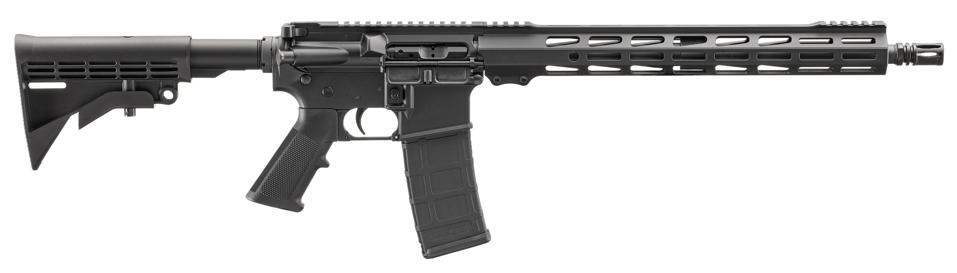 CALIBER: 5.56 NATO - Stock A2 - Handguard Partial Picatinny with M-LOK Attachment Slots - Trigger Mil-Spec - Finish Type III Hard Anodized/Nitrided - Grip AR-Style - Sights None - Barrel Length 16.10 - Barrel Contour Government - Thread Pattern 1/2-28 - Capacity 30 - Height 7.25 - Weight 6.6 lb. - Overall Length 35.25 - Length of Pull 10.13-13.38 - Twist 1:8 RH - Grooves 6 - Lower receiver is fitted with A2-pattern pistol grip and M4-style collapsible buttstock on a Mil-Spec buffer tube. - Free float hand guard with slim profile provides enhanced ergonomics. Features Picatinny rail at front and rear of rail at 12:00 and QD sling sockets on both sides. - Magpul M-LOK accessory attachment slots along the 3:00 6:00 and 9:00 positions with 8 intermediate slots on muzzle end. - Threaded barrel features a 1/2-28 threaded muzzle and is fitted with an A2 flash hider which can be removed to allow for use of other muzzle accessories. - Upper and Lower receivers machined to mil-spec dimensions from 7075 forgings and Type III hard coat anodized. Lower receiver includes a tension screw to eliminate play between upper and lower receiver. - Upper receiver includes a forward assist dust cover and brass deflector. - 16.1 Government profile barrel features 6-groove 1:8 twist rifling with a nitrided finish. - Compatible with mil-spec components rifle ships with single-stage GI trigger selector charging handle carbine buffer and spring for confident reliability. - Nitrided bolt and bolt carrier group features staked gas key. - Includes one 30-round Magpul PMAG magazine.