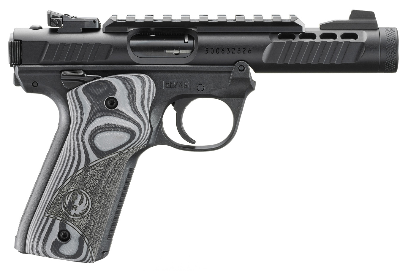 Caliber: 22 LR - Capacity 10+1 - Receiver Material Aluminum - Finish Black Anodized * - Front Sight Fixed - Rear Sight Adjustable - Grip Frame Polymer - Grips Oversized G10 - Barrel Length 4.40 - Barrel Style Non-Threaded - Thread Pattern N/A - Overall Length 8.40 - Width 1.52 - Weight 25.9 oz. - Height 5.50 - Grooves 6 - Twist 1:16 RH - Available in MA Yes - Simple one-button takedown for quick and easy field-stripping and proper chamber-to-muzzle cleaning. Pressing a button in the back of the frame allows the barrel-receiver assembly to tilt up and off the grip frame without the use of tools. - Features a lightweight ventilated aerospace-grade aluminum receiver and a tensioned stainless steel barrel. - Cold hammer-forged barrel results in ultra-precise rifling that provides exceptional accuracy and longevity. - Ergonomic bolt stop. - Internal cylindrical bolt construction ensures permanent sight-to-barrel alignment and higher accuracy potential than conventional moving-slide designs. - Contoured ejection port and easy-to-grasp bolt ears allow for durable and reliable operation round after round. - Accurate sighting system features an adjustable rear sight and a factory-installed Picatinny rail for easy mounting of optics. - Ambidextrous manual safety can be converted to left-side only with included washer. - Features a conveniently located push-button magazine release on the left side of the frame. - Magazine drops free on release for convenient reloading. - Magazine disconnect prevents discharge when the magazine has been removed. - Also includes: two 10-round magazines.