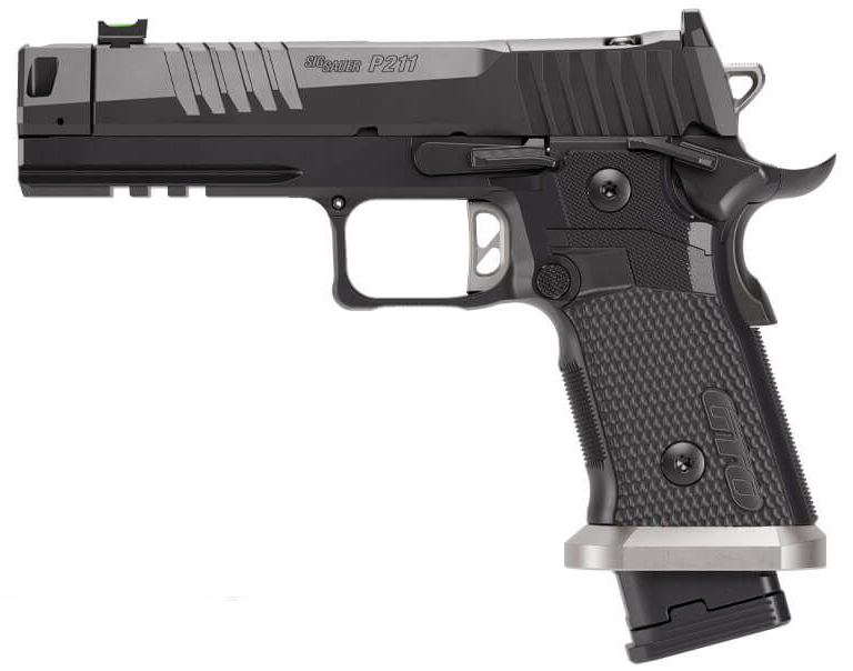 Building upon a legacy of innovation and a heritage of crafting some of the world�s finest hammer-fired pistols the SIG SAUER P211-GTO gives the timeless features and performance driven design of double-stack 1911 pistols a new modern twist. - At its core the P211-GTO is built for speed and precision. Its innovative compensator design uses some of the most advanced manufacturing techniques in the industry capable of delivering unprecedented reductions in recoil and the P211 has been engineered to use the reliable P320 magazine made with unmatched precision and quality. - Engineered to deliver unmatched speed and flawless reliability the SIG SAUER P211-GTO elevates the shooting experience. said Robby Johnson Chief Marketing Officer. It sets a new benchmark for shooters who demand nothing short of exceptional. The P211-GTO combines groundbreaking innovation with the iconic purpose-driven design at the heart of SIG SAUER's legendary heritage. - The P211-GTO pairs a precision-crafted 4.4 bull barrel seamlessly with the new cutting-edge Mach3D compensator. This revolutionary 3D-manufactured compensator uses a specialized gas flow design to dramatically reduce muzzle rise and felt recoil allowing for faster more accurate follow-up shots. - A sleek full-length dust cover adds essential balance and improves weight distribution while providing ample rail space for accessories. The pistol�s robust design ensures enhanced rigidity and a striking tactical aesthetic. The P211's innovative straight-pull trigger provides a consistently smooth clean pull delivering comfort and pinpoint accuracy every time. - The comprehensive safety features of the P211 include a grip safety ambidextrous thumb safeties and a reliable firing pin safety. - 4.4 Bull Barrel paired with a precision-mounted Mach3D compensator - Utilizes P320 magazinees - Steel frame with 3-slot accessory rail and full-length dust cover - Compatible with picatinny rail mounted accessories - Straight-pull trigger for a clean and consistent pull - Precision-engineered alloy grip module - Grip Safety Ambidextrous Thumb Safeties and Firing Pin Safety mechanism - Equipped with (1) 23rd and (2) 21rd P320-Compatible Steel Magazines - CALIBER 9mm Luger - PISTOL SIZE Full-Size - MAGS INCLUDED (1) 23rd and (2) 21rd P320-Compatible Steel Magazines - SIGHTS Fiber Optic Front Black Fixed Rear - OPTIC READY Yes - RX FOOTPRINT SIG-LOC PRO - SIGHT RADIUS 5.56 in - SLIDE FINISH Nitron� - SLIDE MATERIAL Stainless Steel - ELECTRO-OPTIC INSTALLED No - TRIGGER ACTION Single Action Only (SAO) - TRIGGER TYPE Flat Skeletonized - MANUAL SAFETY Yes - FRAME FINISH Nitron - FRAME MATERIAL Stainless Steel - GRIP MODULE Alloy - GRIP TYPE G10 Grip Panels - GRIP COLOR Black - ACCESSORY RAIL 1913 Picatinny Rail - BARREL LENGTH 4.4 in Bull Barrel paired with MACH3D Compensator - THREADED BARREL No - BARREL MATERIAL Carbon Steel - OVERALL LENGTH 8.5 in - OVERALL WIDTH 1.48 in - HEIGHT 5.25 in - WEIGHT 36.9 oz (1.12 kg)