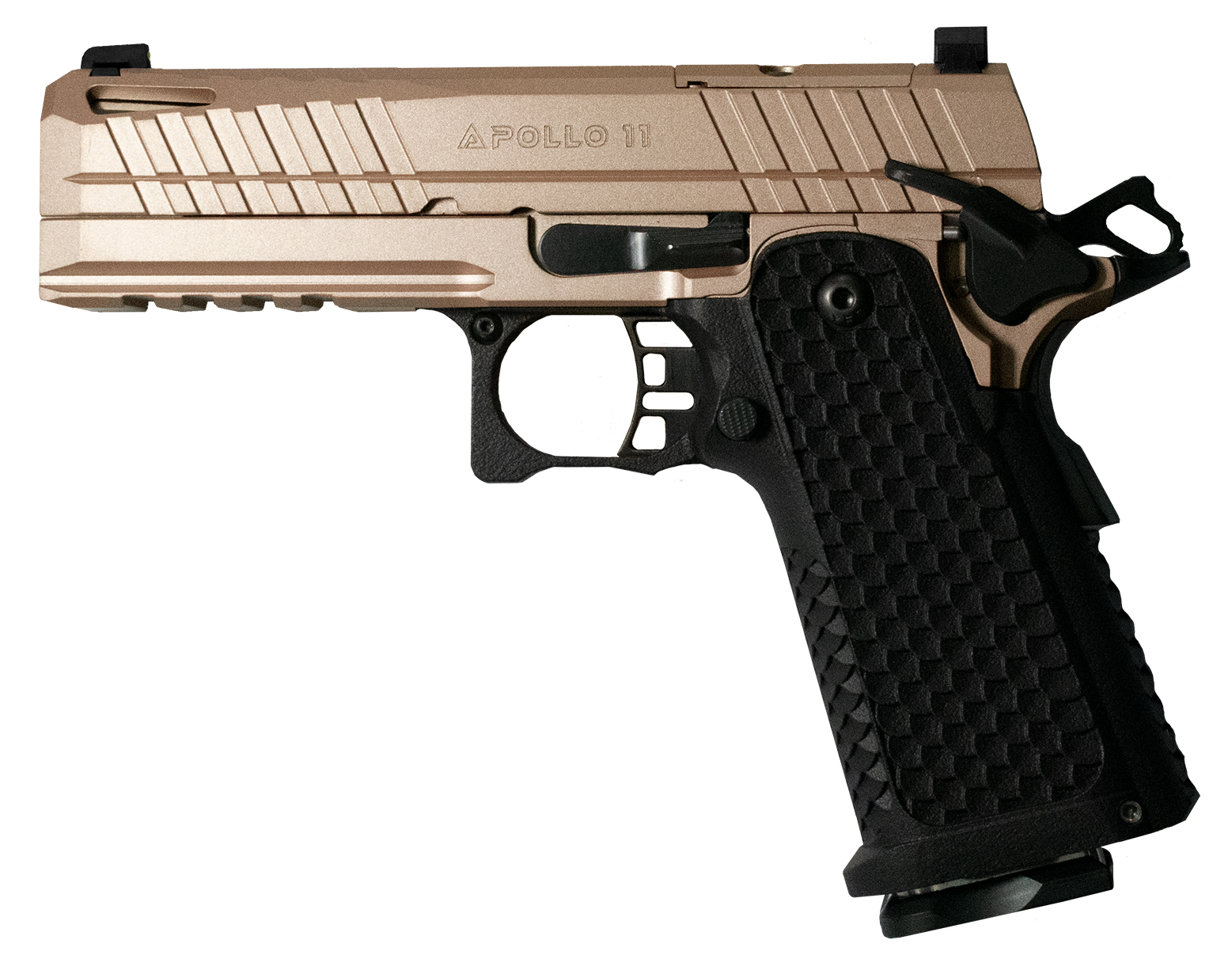 Introducing the cutting-edge Apollo 11 9mm Pistol a marvel of firearm engineering that seamlessly blends timeless design with modern innovation to deliver unmatched performance and reliability. Crafted with precision and attention to detail this pistol is the embodiment of form and function. The Apollo 11 pistol boasts a sleek and elegant profile with a heat treated 416 stainless steel slide 4140 steel frame that exudes sophistication. Its streamlined frame available in various colors not only looks stunning but also ensures excellent ergonomics for a comfortable grip and easy handling. This pistol offers a double-stack magazine design allowing for an impressive capacity of up to 17+1 rounds of 9mm ammunition. Whether for self-defense competitive shooting or target practice you'll have ample firepower at your disposal. The heart of the Apollo 11 pistol lies in its meticulously engineered components. Its match-grade barrel guarantees exceptional accuracy while the finely tuned trigger system provides a crisp consistent break for precise shot placement. The Apollo 11 features a match grade 4.9 inch bushingless-bull barrel that is honed burnished to an 8-micron finish and rifle cut for unparalleled accuracy. Each component is hand-fitted for optimal performance. With its innovative recoil reduction system and aggressive grip texture this pistol delivers minimal recoil allowing for rapid follow-up shots and improved accuracy. Whether you're a seasoned shooter or a novice you'll appreciate the reduced muzzle rise and enhanced control. Personalization is key and the Apollo 11 9mm Pistol offers a range of customization options. Accessory rails enable the attachment of lights lasers and other tactical enhancements. The slide comes standard with an RMSc optic cut to directly mount a sight without cumbersome plates or adapters. Your safety is paramount and this pistol incorporates modern safety features including a grip safety and a robust ambidextrous manual thumb safety for peace of mind while carrying and handling. Engineered to withstand the rigors of extended use the Apollo 11 9mm Pistol is constructed from high-quality materials. Its durable finish resists wear and corrosion ensuring a long service life. This pistol is designed to perform flawlessly even in adverse conditions. Whether you're a professional in the field or a recreational shooter at the range the Apollo 11 pistol adapts to your needs. Its adaptable design makes it suitable for home defense concealed carry or competitive shooting. - The Apollo 11 9mm Pistol is a harmonious blend of classic design and modern technology offering an exquisite combination of style accuracy and guaranteed reliability. With its enhanced capacity precision engineering and customizable features it stands as a testament to the evolution of firearms design and is sure to exceed your expectations. Experience the pinnacle of handgun craftsmanship with the Apollo 11 pistol. - Caliber 9x19mm - Weight (No Magazine) 35.2 oz - Slide Width 0.925 - Width (Overall) 1.21 - Slide Length Complete 7.42 - Length (Overall) 8.41 - Height (Overall) 5.46 - Magazine Capacity 17 - Barrel Length 4.9 - Barrel Rifling 1:16 Left Hand - Length of Twist 4.11 - Trigger Pull 3.5lbs-4.5lbs - Trigger Travel 0.310 - Sight Radius 5.92 - Model Apollo 11 - Optic Cut (Footprint) RMSc