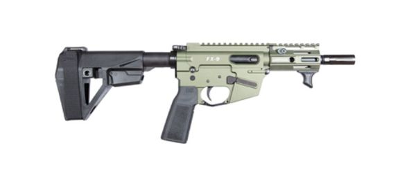 Freedom Ordnance FX9 Elite, Semi-automatic, Pistol, 9MM, 4" Barrel, Flash Suppressor, Anodized Finish, Olive Drab Green, SBA5 Pistol Brace, BCM B5 Grip & Trigger Guard, Warhammer Ambidextrous Charging Handle, Finger Stop, 32 Rounds, 1 Magazine FX9P4E-ODG