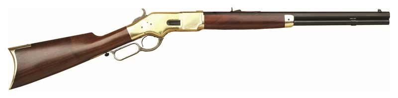 Originally known as the Improved Henry due to its patented loading gate on the side of the frame designed by Nelson King Winchester's plant superintendant and the addition of a wood forearm the 1866 model was known as the Yellow Boy by the Native Americans because of its brass frame. The '66 model was the first true cowboy lever-action and the first that adapted well to carrying in a saddle scabbard due to its slab sided design. With over 170000 made between 1866-1898--it's popularity continued long after more powerful lever guns were introduced. The '66 model was famous worldwide with guns used by the forces of Benito Juarez in Mexico the Turkish army in their fight against the Russians and in the Wild West by such notables as Sioux Medicine Man Sitting Bull the Union Pacific's chief engineer General Grenville Dodge and desperado Bill Doolin. - Cimarron offers several 1866 Yellowboys such as the 24-inch barreled Sporting Rifle a 20-inch Short Rifle (both of these models sport octagon barrels) round barreled carbines including the 19-inch saddle ring carbine a brass tack-decorated 19-inch Indian carbine and a 16-inch Trapper model. Calibers available include .45 Colt .44-40 .44 Special .38 Special .38-40 .32-20 and .22 Long Rifle and with finishes like the Standard Blue Charcoal Blue or Original Finish depending on which model you select. One of Cimarron's true handsome Old West classics! - Caliber: .45 COLT - Style: Short Rifle - Capacity: 10 Rnds. - Frame: Brass - Finish: Standard Blue - Stock/Forearm: Walnut - Weight: 7.56 Lbs.