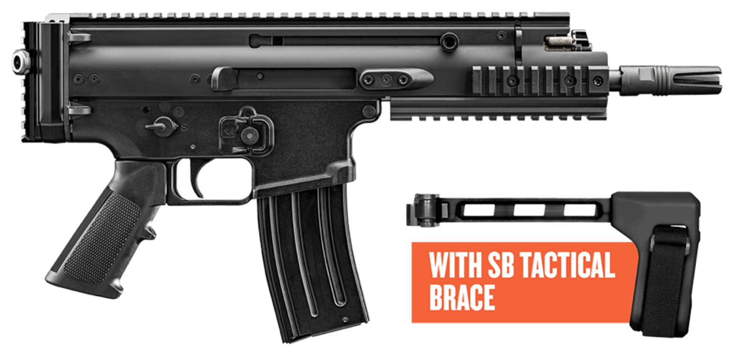 PRIMARY FEATURES - Gas-operated SCAR pistol chambered in 300BLK and modeled after the FN SCAR�-SC personal defense weapon (PDW) available to military and law enforcement - Short-stroke gas piston system with adjustable low-flash gas regulator greatly improves reliability over direct-impingement systems - Non-reciprocating charging handle assembly can be used as a hand stop when locked in the forward position - 7.5-in. cold hammer-forged chrome-lined and free-floated barrel; three-prong flash hider - One-piece machined aluminum receiver with MIL-STD 1913 rails at 3 6 9 and 12 o'clock positions for mounting of optics or accessories - Ships in premium zippered case for discreet transport - Rear vertical Picatinny rail with quick detach (QD) sling cup; compatible with aftermarket and FN SCAR� buttstocks - Specs - Caliber: .300 BLK - Operation: Short-stroke gas piston - Mag Capacity: 30 Rd. (.300 BLK) - Weight: 5.65 lb. - Barrel Length: 7.5 - Overall Length: 19.75