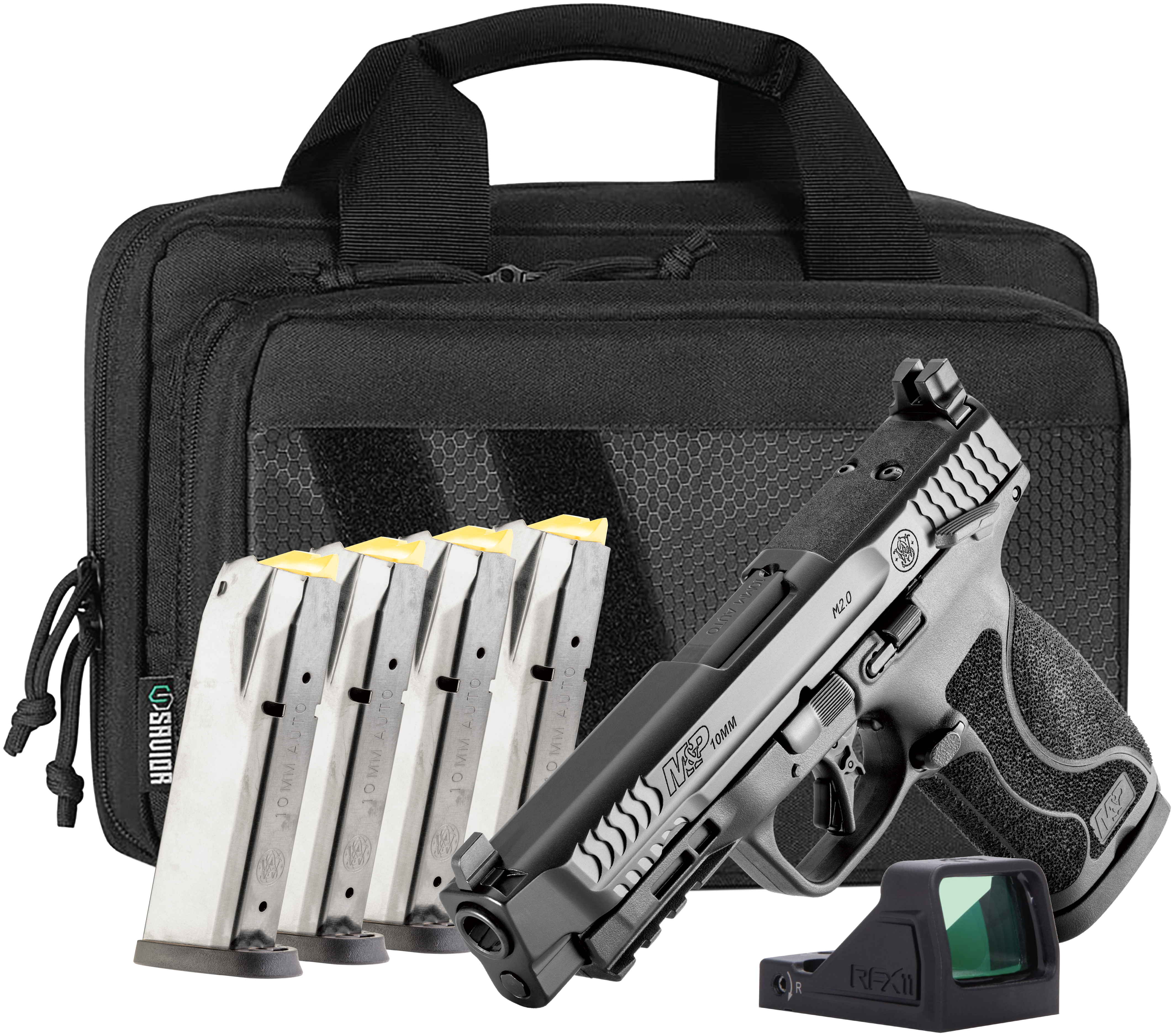 Designed to shoot bigger faster flatter and farther. Whether for hunting self-defense or the range M&P�10MM delivers when you need it most. - Optic-Ready Slide- Slide cut to fit the a variety of optical sights using C.O.R.E. system plates. - Flat-Face Trigger- Flat design that allows for consistent trigger finger placement giving you more accurate and repeatable shooting. - Optimized Handling- With its 18-degree grip angle the M&P platform offers users a natural point of aim allowing them to get on target quicker. In addition our aggressive grip texture and rigid metal frame gives users the ability to better mitigate recoil - Slide cut for optics - M2.0� flat-face trigger for consistent finger placement that allows for more accurate and repeatable shooting - Low barrel bore axis makes the M&P� pistol more comfortable to shoot reducing muzzle rise and allowing for faster aim recovery - Optimal 18-degree grip angle for natural point of aim - Four interchangeable palmswell grip inserts for optimal hand fit and trigger reach- S M ML L - Enhanced grip texture allows the user to manage recoil keep a firm grip and delivers comfort when concealing - New M&P� M2.0 crisp trigger with lighter trigger pull - Tactile and audible trigger reset - Accurate 1 in 10 twist M&P� M2.0 barrel - Extended rigid embedded stainless steel chassis to reduce flex and torque when firing - BUNDLE ALSO INCLUDES: - Viridian� RFX11 Optic - Savior Equipment� Pistol Bag - Three Additional 15rd Mags - Up to $340 Value! - width 1.3 in - length 7.9 in - height 5.6 in - weight 29.6 oz - CALIBER 10MM - SIZE FULL - CAPACITY 15 - ACTION STRIKER FIRED - BARREL LENGTH 4.6 - GRIP POLYMER - SIGHTS OPTIC HEIGHT WHITE DOT - OPTIC READY YES - SAFETY THUMB SAFETY - COLOR/FINISH BLACK - STATE COMPLIANCE CO DE IL VT - THREADED BARREL NO - BARREL MATERIAL STAINLESS STEEL - FRAME POLYMER - LASER NO - NUMBER OF MAGAZINES 5 - 10LB TRIGGER NO - MODEL M&P 2.0