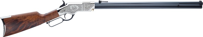 ACTION: Lever Action - FINISH: Blue - STOCK/FRAME: Wood Stock - STOCK/GRIPS: American Walnut - CALIBER/GAUGE: 44-40 - BARREL: 24 - RECEIVER: Aluminum Alloy (Polished) - ADDL INFO: Scrollwork On Receiver Aluminum Alloy Buttplate