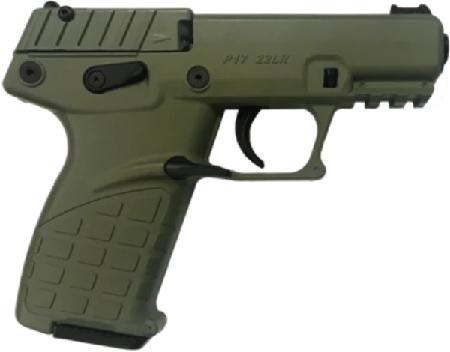 Kel-Tec P17, Single Action Only, Semi-automatic, Polymer Frame Pistol, Compact, 22LR, 3.8" Barrel, Threaded 1/2x28, Matte Finish, Olive Drab Geen, Fiber Optic Front Sight, 10 Rounds, 3 Magazines P17BGRN10