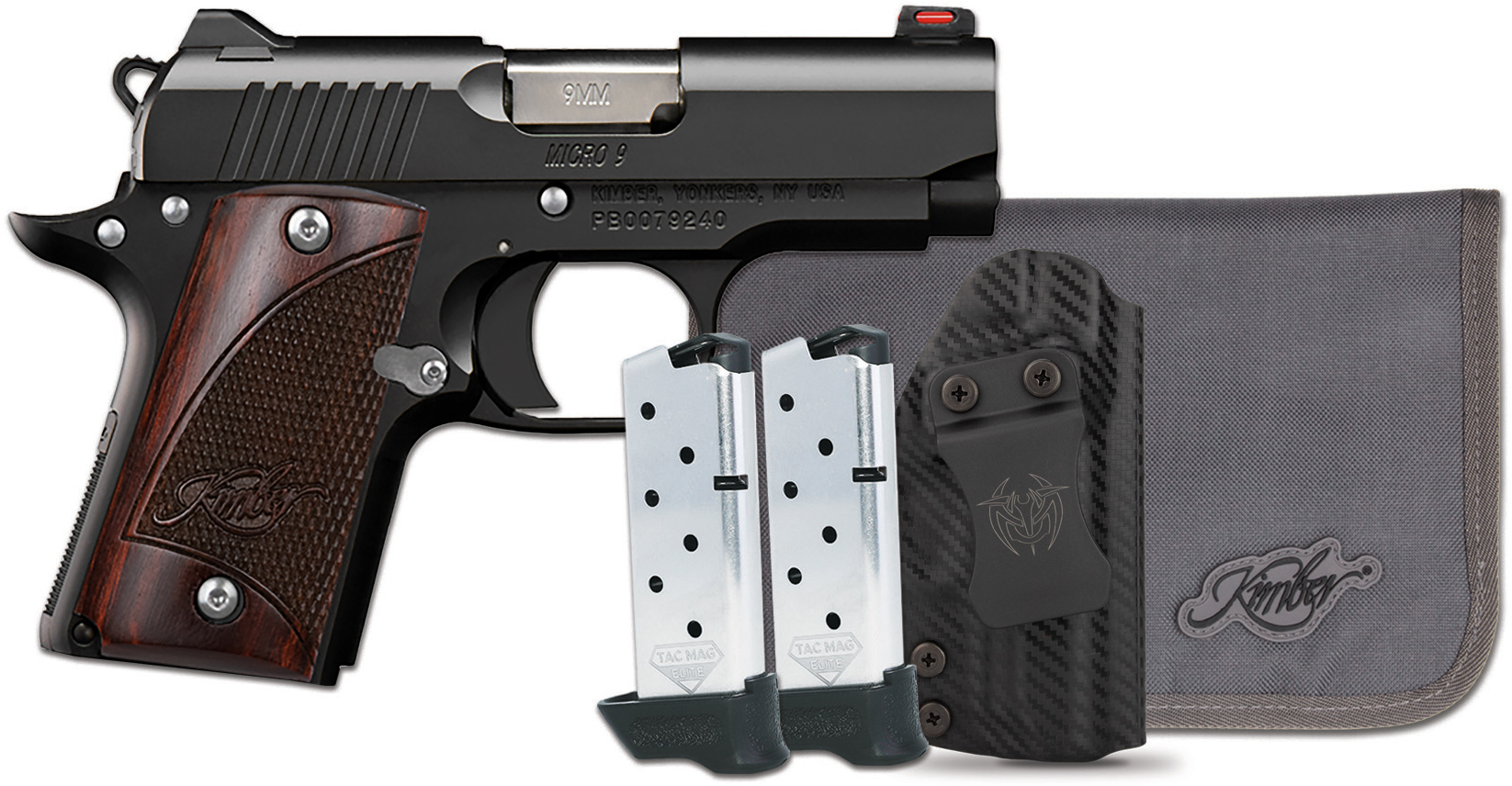 Kimber America Micro 9 RTC, 1911, Semi-automatic, 9MM, Metal Frame Pistol, 3.15" Barrel, KimPro II Finish, Black, Rosewood Grips, Fiber Optic Front Sight, Thumb Safety, 7 Rounds, 2 Magazines, Includes Tactical Qualifier Ambidextrous Holster 3300253