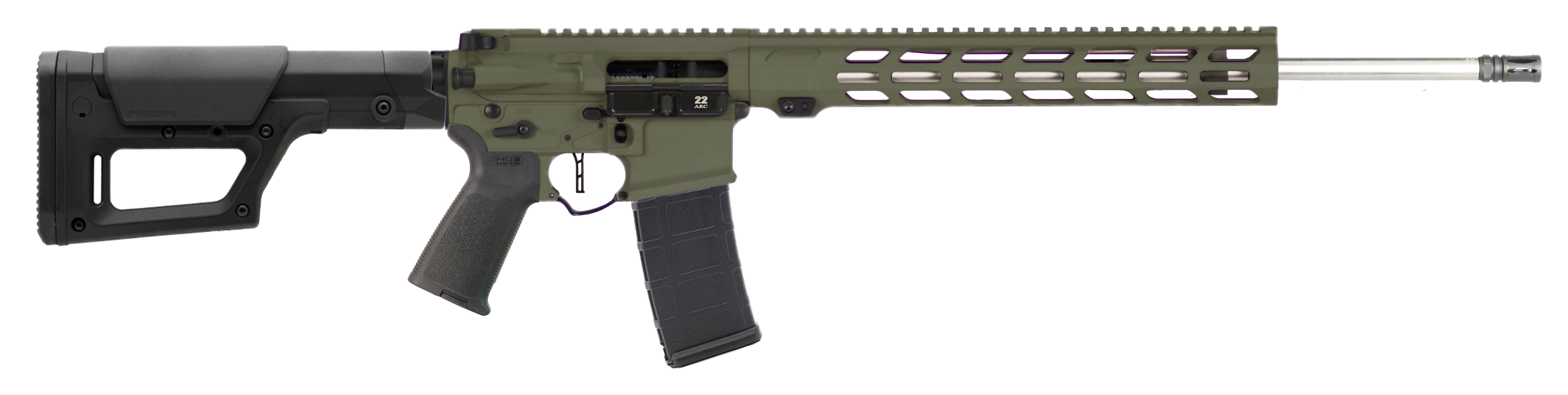 22 416 SST Barrel (1:7 Twist) - .750 Rifle-Length Gas System - Diamond-Honed Nitride M16 BCG (6.5 Grendel Bolt Face) - APF 3.5 lb. Drop-In Trigger - APF Adjustable Gas Block - Magpul PRS Lite - Magpul MOE Grip - APF 15 M-Lok Handguard - Billet Receiver Set - Ambidextrous Controls - Caliber/ Gauge: 22 Arc - Barrel Length: 18 416 SST Barrel (1:7 Twist) - Action: Semi-Auto - Front Sight: Rear Sight: None - Color: ODG - Finish: Cerakote - Material: Aluminum - Hand: Right