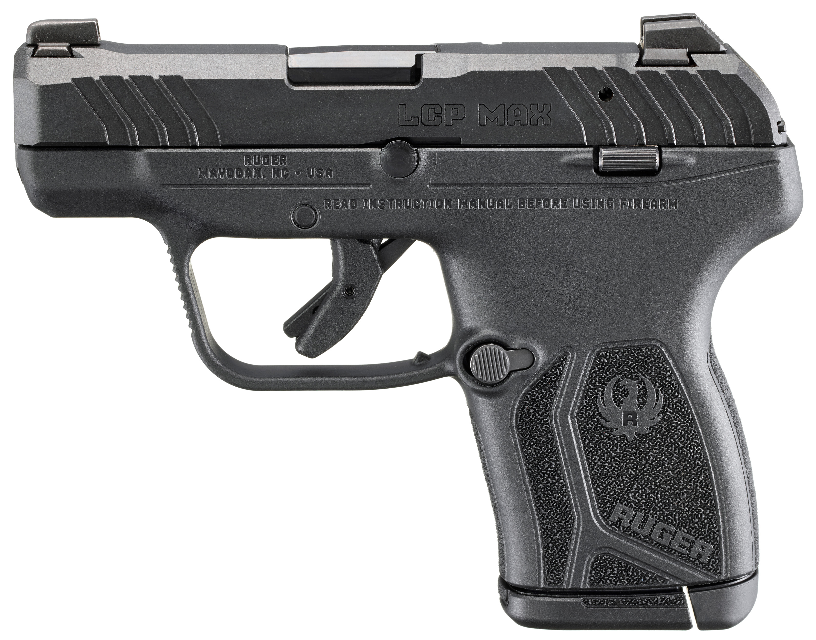 CALIBER: 380 AUTO - Capacity 10+1 - Slide Material Alloy Steel - Slide Finish Black Nitride - Slide Width 0.75 - Manual Safety No - Grip Frame Black High-Performance Glass-Filled Nylon - Barrel Material Alloy Steel - Barrel Finish Black Oxide - Barrel Length 2.80 - Overall Length 5.17 - Front Sight Tritium with White Outline - Rear Sight Drift Adjustable - Weight 10.6 oz. - Height 4.12 - Grooves 6 - Twist 1:16 RH - Compact and lightweight the LCP MAX continues to be the definitive pocket-sized personal protection pistol. - Standard 10-round magazine ships with flush floorplate installed. - Textured grip frame provides a secure and comfortable grip. Utilizing the 12-round magazine or included finger grip extension floorplate with the 10-round magazine allows most shooters a full-firing grip. - Slide and frame surfaces and edges are smooth for comfortable carry and handling. - Tritium front sight with white outline makes for fast acquisition in all light conditions. - Rear sight features a generous u-notch for easy alignment and a square front face for one-handed cocking. Sight dovetails are sized to accept aftermarket Bodyguard-pattern sights. - Improved magazine feed lips feed ramp extractor and barrel cam geometries. - Patented barrel cam geometry delays unlocking slows the slide and ultimately reduces felt recoil compared to other .380 Auto pistols. - Utilizes Ruger's safe reliable and proven Secure Action fire-control system that combines a protected internal hammer with a bladed-safety trigger. The trigger has a short smooth pull clean break and positive reset. - Reversible magazine release. - Also includes: one 10-round magazine; soft pocket holster; magazine loader