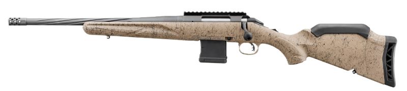 Caliber: 5.56 NATO - Stock Flat Dark Earth Splatter Gen II American - Barrel Style Spiral Fluted - Barrel Length 16.10 - Barrel Finish Cobalt Cerakote - Thread Pattern 1/2-28 - Capacity 10 - Magazine Type AR-Style - Sights None-Picatinny Scope Base - Material Alloy Steel - Weight 6.2 lb. - Twist 1:8 RH - Overall Length 37.35 - Length of Pull 12-13.75 - Grooves 5 - Splatter finished stock provides excellent grip without being too sharp or abrasive. - Soft rubber recoil pad features a large radius on the heel for easy shouldering and improved geometry that progressively collapses to reduce felt recoil. - Removing the installed spacer allows for length of pull to be adjusted from 13.75 to 12. - Installed low comb improves sight alignment when using magnified optics but can be removed when utilizing low-mounted sights. - Professionally applied Cerakote coating on barrel muzzle brake receiver and bolt handle results in a durable easy-to-maintain finish. - Medium contour barrel features deep spiral flutes that reduce weight at the muzzle end of the barrel to improve balance without sacrificing stiffness or accuracy. - Compact threaded barrel with factory-installed radial port muzzle brake is cold hammer-forged resulting in ultra-precise rifling that provides exceptional accuracy and longevity. - Intuitive three-position tang safety locks the bolt preventing inadvertent bolt opening while allowing the rifle to be loaded with the safety engaged. - Ruger Marksman Adjustable trigger offers a crisp release with a pull weight that is user-adjustable between 3 and 5 pounds. - Patented Power Bedding integral bedding block system positively locates the receiver and free-floats the barrel for outstanding accuracy. - The one-piece bolt is CNC machined from stainless steel for smooth operation and the familiar three-lug design with 70� throw provides ample scope clearance. - Oversized bolt handle for positive bolt manipulation with a 5/16-24 thread pattern for easy replacement. - Factory-installed one-piece Picatinny scope base. - Available accessory stock weight kit adds up to 1.6 pounds to the butt of the rifle to absorb recoil and improve the rifle's balance when utilizing heavier muzzle devices. - Also includes: one magazine; steel sling swivel studs.