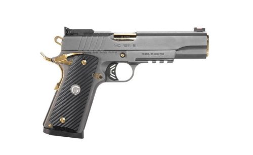 Girsan MC1911 Negotiator, Semi-automatic, 1911, Metal Frame Pistol, Full Size, 38 Super, 5" Barrel, Titanium Nitrate Finish, Black with Gold Accents, G10 Grips, Adjustable Sights, Ambidextrous Safety, Extended Beavertail, 9 Rounds, 1 Magazine 390399