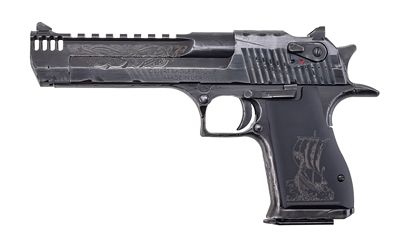 Harness the untamed power of a legend reborn with the spirit of a warrior. We've taken the iconic Desert Eagle pistol a symbol of raw strength and cinematic history and infused it with the soul of the Norsemen. This is not just a firearm; it's a masterpiece of power and artistry crafted for the modern-day Viking. - The distressed battle-worn finish tells a story of glorious conflict while the slide and barrel are deeply engraved with intricate flowing knotwork reminiscent of ancient sagas carved in stone. This masterpiece is built upon the powerful and unmistakable Desert Eagle platform ensuring legendary performance. - Complemented by a distressed gray and black battle-worn finish for a rugged heirloom appearance. The experience is completed by the beautifully engraved Viking longship on the custom aluminum grips. - Functionality is not sacrificed for form; it boasts modern performance features including an integrated muzzle brake for superior control and a Picatinny style rail ready for your preferred optics. - Don't just own a firearm. Wield a legend. - Model DE50VK1 - Caliber .50 AE - Barrel 6 - Length O/A 10.75 - Height 6.25 - Slide Width 1.25 - Weight 4 lbs. 7 oz. - Sights Combat Type Fixed - Finish Distressed Gray and Black Battle-worn Finish - Magazine 7 rd
