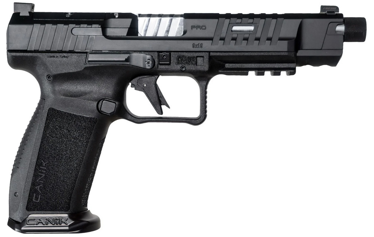 The Mete Pro series is the direct answer to the consumers request for a Canik handgun with style and performance. With aggressive new features at a price still well under the competition the Pro series is ready to move! - The CANiK METE SFx Pro 9mm semi-automatic striker-fired pistol features an integrated safety and comes standard with a flat-faced 90-degree break trigger crisp break and short reset. Additionally the Pro Series features a tritium front sight blacked out rear sight fluted and chrome-plated barrel with 1/2x28 threads and aggressive slide serrations. It was designed for competitive shooters and gun collectors alike. This dependable accurate handgun is packed full of high-value features and comes with everything you'll need to compete against the best in any class. - Includes - (1) 18 Round Magazine & (1) 20 Round Magazine - Magazine E-Z Loader & Gun Lock - IWB/OWB Reversible Holster - (2) Alternate backstraps for a custom fit - Angled rear sight edge for emergency one-hand operation - (2) Optic Interfaces & Co-Witness optics ready slide cut - Low profile ambidextrous slide stop release for easier engagement - Canik Punch/Tool Kit & Cleaning Kit - Short reset Single-Action Polymer trigger design with nickel-coated action components - Tritium front sight and blacked-out rear sights - Aggressive front and rear slide serrations for positive-traction handling - 1913 Picatinny under-barrel rail - Loaded chamber indicator - Side reversible magazine catch - WEIGHT 1.88 lbs - CAPACITY 18/20 rounds - FRONT SIGHT Tritium - CARTRIDGE 9mm Luger - MAGAZINE TYPE Canik Full Size Magazine - REAR SIGHT Blacked-out - MAGAZINE INCLUDED 1 x 18 & 1 x 20-Round Magazine - FINISH COLOR Black - ACTION TYPE Semi-Automatic - FRAME MATERIAL Synthetic - OVERALL LENGTH 8.83 - BARREL LENGTH 5.74 - HEIGHT 5.75 - WIDTH 1.41 - MANUFACTURED Made in Turkey