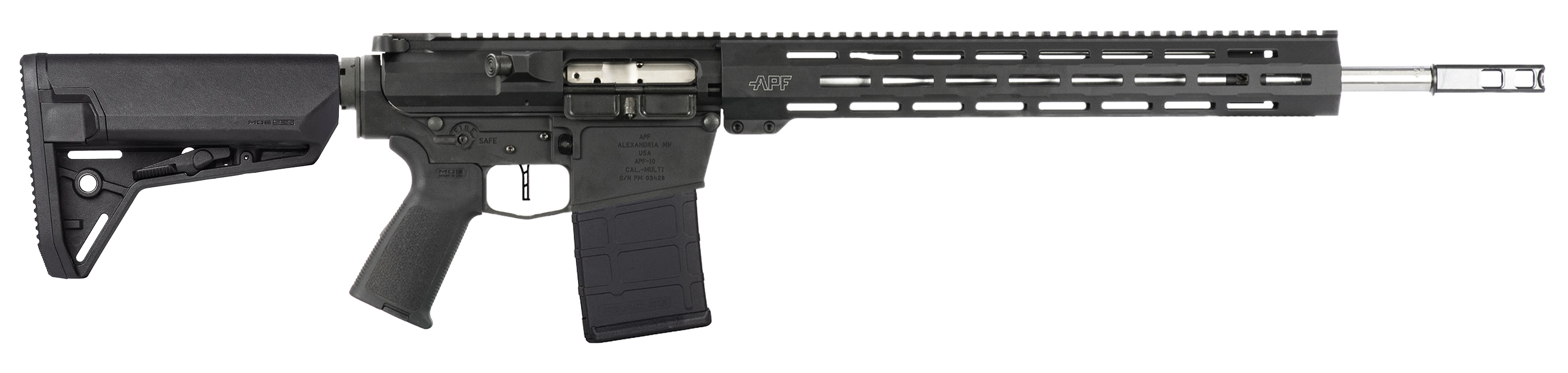 Dominate the long-range game with the APF Armory AR10 DMR 2.0 a precision-crafted beast engineered for elite performance and unyielding power! - Hand-built by Alex Pro Firearms in Alexandria Minnesota this American-made AR-10 DMR is the pinnacle of long-range shooting hunting and tactical dominance. - Featuring a 18-inch 416 stainless steel barrel the DMR 2.0 delivers surgical accuracy in hard-hitting calibers like 22-250 REM .243 Win .308 Win 6mm Creedmoor and 6.5 Creedmoor. - The 15-inch MLOK handguard maximizes customization letting you mount high-end optics bipods or lights for any mission. Paired with a Butcher-16 muzzle brake to crush recoil and muzzle rise and a Nickel Boron BCG for buttery-smooth cycling this designated marksman rifle is built for relentless reliability. - The APF drop-in 3.5lb single-stage flat trigger ensures crisp responsive shots while the Magpul PRS stock and MOE grip offer unmatched comfort and control. - Dressed in bold Cerakote finishes like Flat Dark Earth Tactical Mermaid or Stealth Gray (among many other options) the AR10 DMR 2.0 is as striking as it is deadly.
