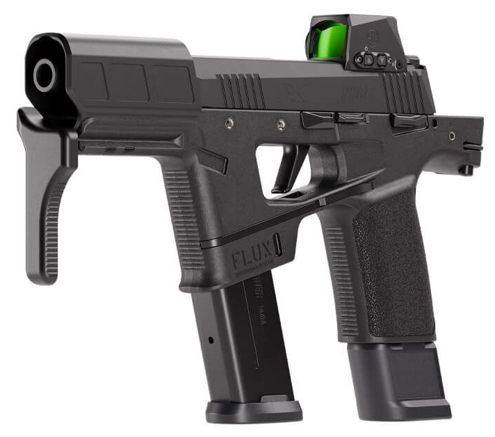 The P365 FLUX meshes a 9mm handgun with a PCC style platform bringing the speed maneuverability and concealability of a pistol combined with the stability of a carbine. The P365-FLUX delivers a host of innovative features and enhancements including a spring deployable brace for rapid utilization muzzle shroud front picatinny mount for a variety of accessories XRAY3 Day/Night sights ambidextrous controls and up to a 46-round capacity. - P365 FLUX FEATURES: - 46 Round Capacity (Sentry Model) - Ambidextrous dual magazine release and controls - Muzzle Shroud - Front Picatinny Rail - Spring Deployable Brace - Optional SBR Stocks Available - 6 custom barrel integrated with extended muzzle shroud - CALIBER 9mm Luger - PISTOL SIZE Compact PDW - MAGS INCLUDED (1) 17rd / (2) 21rd Steel Mags - SIGHTS XRAY3 Day/Night Sights - OPTIC READY Yes - SIGHT RADIUS 5.6 in - SLIDE FINISH Nitron� - SLIDE MATERIAL Stainless Steel - ELECTRO-OPTIC INSTALLED Yes - TRIGGER ACTION Striker - TRIGGER TYPE Flat Faced - MANUAL SAFETY Yes - FRAME MATERIAL Stainless Steel - GRIP MODULE FLUX P365 Chassis - GRIP MATERIAL Standard Polymer - GRIP COLOR Black - ACCESSORY RAIL 1913 Picatinny Rail - FCU MATERIAL Stainless Steel - BARREL LENGTH 6 in [152.4 mm] - THREADED BARREL No - BARREL MATERIAL Carbon Steel - OVERALL LENGTH 19.12 in - OVERALL WIDTH 1.34 in Deployed / 1.52 in Folded - HEIGHT 7.75 in - WEIGHT 49.2 oz [ONE MAG]