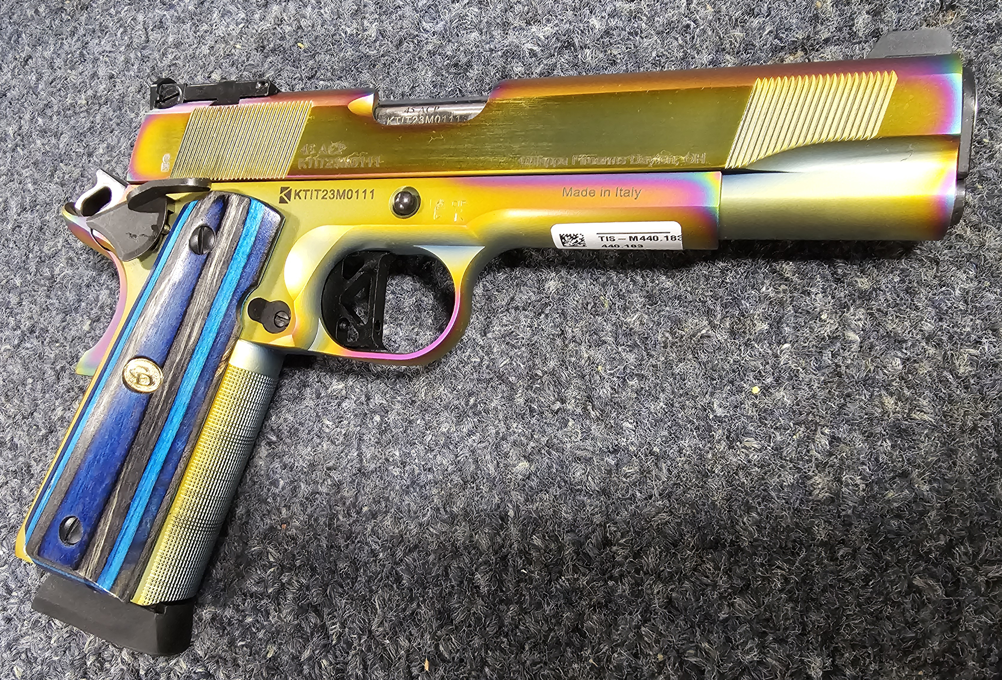 Caliber: .45 ACP - Action: Semi-Auto - Barrel Length: 5'' - Capacity: 8+1 Rounds - Feed In: Magazine - Trigger System: Single - Grips: Blue Laminate - Rear Sight: Target Adj. Windage & Elevation - Safety: Manual & Internal - Total Length: 8.63'' (219 mm) - Material: Steel - Net Weight: 1.2 - Finishing: Mix Color - Extraction: Auto Ejection - Ships Loose: Manual + 2-8 Round Magazines