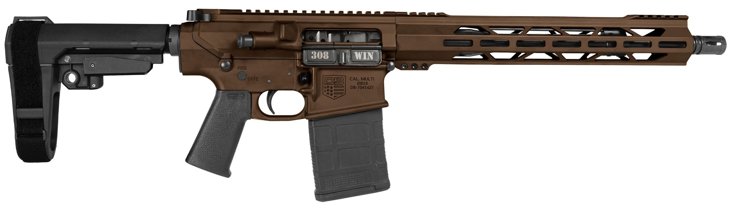 Finish: Midnight Bronze Cerakote - Caliber: .308 Winchester - Barrel: 13.5 in 1:10 RH Medium 4150 CrMov Black Nitride - Gas System: Mid-Length - BCG: Shot-Peened Magnetic Particle Inspected Mil Spec 8620 Carrier - Upper: A3 Flattop Forged 7075 T-6 Aluminum - Lower: Forged 7075 T-6 Aluminum (DB10 Black Gold Lower) w/ Enhanced Trigger Guard - Handguard: 13 in M-LOK (V-Rail) w/ Anti-Slip Texture Pads - Grip: Magpul MOE K Grip - Stock / Brace: SB Tactical SBA3 Brace - Magazine: Magpul Gen M3 PMAG 20 Round - Sights: None - Muzzle Device: A2 Flash Hider (5/8 x 24) - Trigger: Standard Mil-Spec - Weight: 5.1 lbs - Length (Collapsed / Extended): 31in