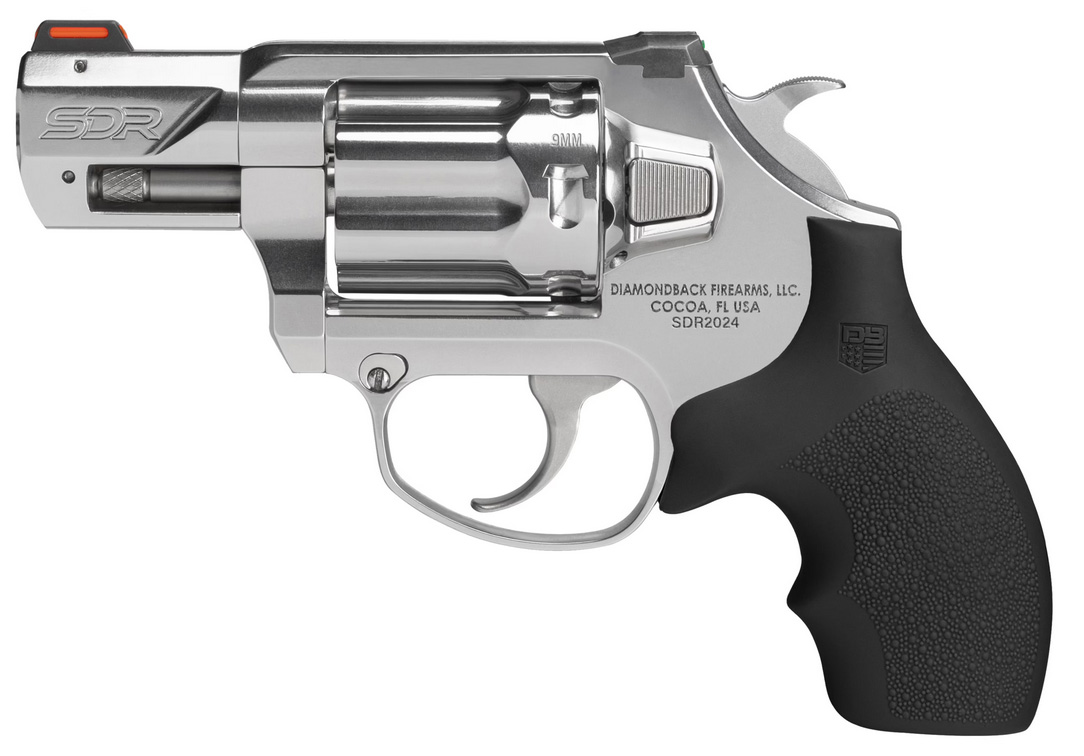 Designed for those who prioritize reliability and quality the SDR delivers peace of mind to home and personal defense situations. The SDR�s compact frame two-inch barrel and six shot 9mm cylinder are machined from premium stainless steel for strength and durability. Low profile fiber-optic sights and a sleek frame with concealed hardware and rounded edges prevent snags and hang-ups when the revolver is drawn. Weighing in at just 21 ounces this compact package is perfect for concealed carry. An exceptionally smooth match grade trigger and high-vis sights promote accuracy and create confidence in every shot while an ergonomically placed push button cylinder release and chamfered cylinder chambers and TK Custom moon clips ensure seamless loading and round ejection. - Specifications - Caliber: 9mm +P - Length: 6.53 in - Width: 1.38 in - Height: 4.44 in - Weight: 21.2 oz - Frame Material: Forged Stainless Steel - Frame Finish: Polished Stainless Steel - Barrel Length: 2 in - Barrel Material: Stainless Steel - Barrel Finish: Polished Stainless Steel - Grooves: 6 - Capacity: 6 Rounds - Cylinder Material: Stainless Steel - Action: DA/SA - Trigger Pull: 9-11.5 lbs Non-Stacking - Front Sight: Fixed Fiber Optic - Orange - Rear Sight: Low Profile Dovetail Fiber Optic Green - Grip: Hogue Black Rubber W/ Diamondback Logo