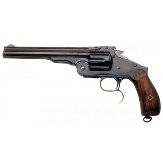 The Russian was a favorite side arm of the Russian government and is the largest of the top-break revolvers. Modeled after the Smith & Wesson Schofield this revolver features a hump-backed frame two-piece walnut grips lanyard ring and triggerguard with a spur. The Russian barrel latch opens up and forward with a rear sight notch incorporated into it. - Caliber: .44RUSSIAN - Barrel Length: 6.5 Inch - Capacity: 6 - Weight: 2.7 lbs - Finish: Blued - Grip/Stock: 2-piece Walnut with lanyard ring - Sights: Blade Front Rear sight on back of barrel - Overall Length: 12.16 Inches