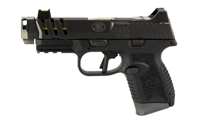 The premiere compensated handgun in the FN Edge Series is perfected in the FN factory for ideal concealed carry performance. An auto-indexing FN compensator cuts muzzle flip by 25% enabling faster more accurate shots at speed. Takedown for maintenance is faster than any other compensated pistol just push in and twist 90 to field strip. - FN's patented Low-Profile Optics Mounting System makes the FN 509 CC Edge optics-ready; simply mount and zero a favorite red dot. A flat-faced trigger puts all the precision in hand with a smooth take-up and positive wall. Driven with a high-endurance striker the duty-ready fire control system has a best-in-class pull at 5.6-lbs. - PRIMARY FEATURES - FN compensator cuts muzzle flip 25% - Patented FN Low-Profile Optics Mounting System - Precision flat-faced trigger - ACCURACY - Hammer-forged barrel target-crowned - Trigger breaks clean at 5.6-lbs. high-endurance striker - Co-witnessing height fiber-optic front sight - CONTROL - Lightening-cut slide speeds follow-up shots - Auto-indexing compensator removes without tools - Stippled frame texture enhances grip - Two included backstraps fit any hand size - VERSATILITY - Immediately add most MRDs and lights - Ambidextrous slide stop - Long-wearing PVD and TiN barrel finish for lubricity - Polished chamber and feed ramp - SPEED - Weighted magazine base pads speed reloads - Oversized knurled mag release reversible - Clean and light trigger with short reset - CALIBER: 9mm - MAGAZINE: 10 Rd - WEIGHT: 25.5 OZ. - BARREL LENGTH: 4.2 - LENGTH: 7.5 - OPERATION: DOUBLE ACTION STRIKER-FIRED - FINISH: GRAPHITE PVD (PHYSICAL VAPOR DEPOSITION) TYPE III ANODIZING GOLD TITANIUM NITRIDE - ACCESSORIES INCLUDES: - PREMIUM BALLISTIC CASE - FOUR MRD MOUNTING PLATES - TWO FRAME BACKSTRAPS - THREE MAGAZINES