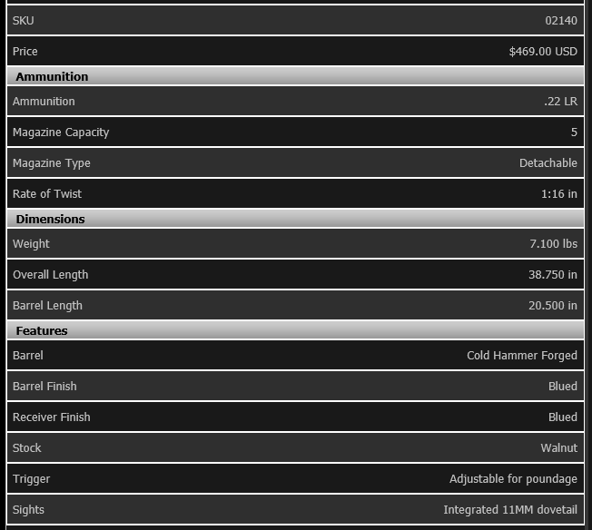 457 Lux 22WMR 5rd 20.5"023028067030230215 (special order)$704.95