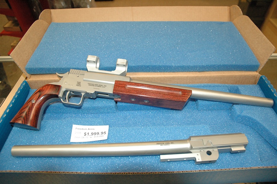 This is a super rare Single Shot from Freedom Arms. It comes as pictured, with two barrels - 7mm08 and 454 Casull.